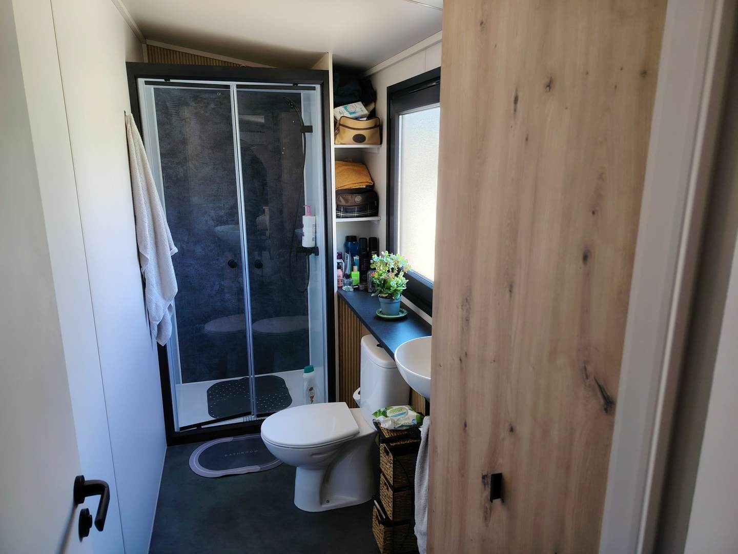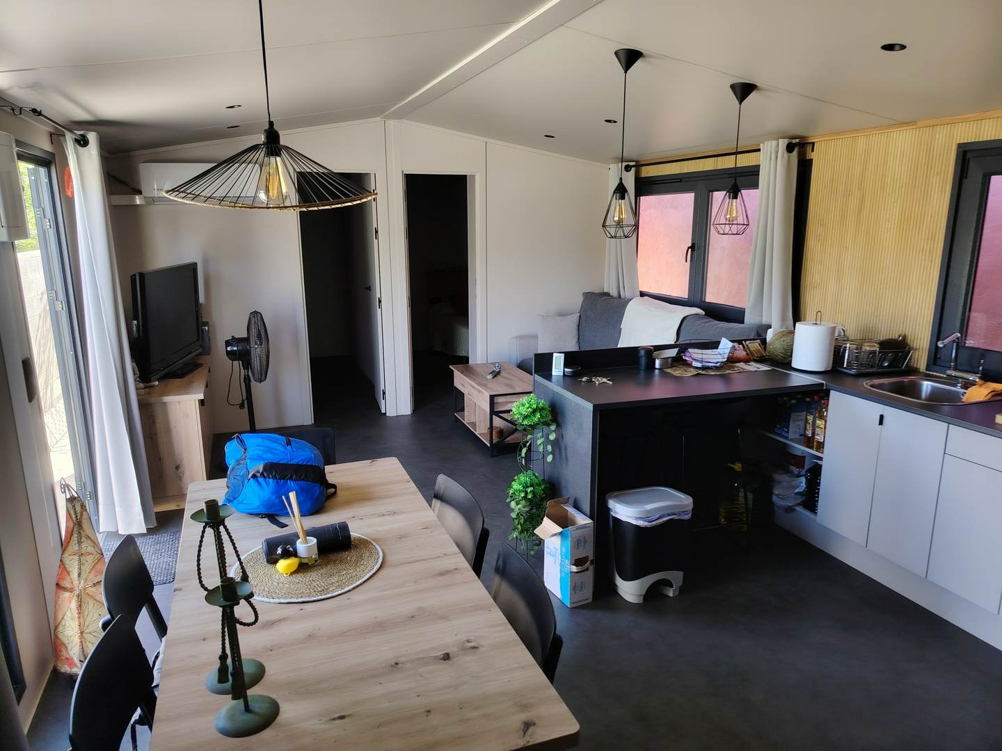 Un espacio de 50 M2 con tres habitaciones y un baño, salón con cocina integrado, estilo moderno, está en población y en parcela de 200m2
